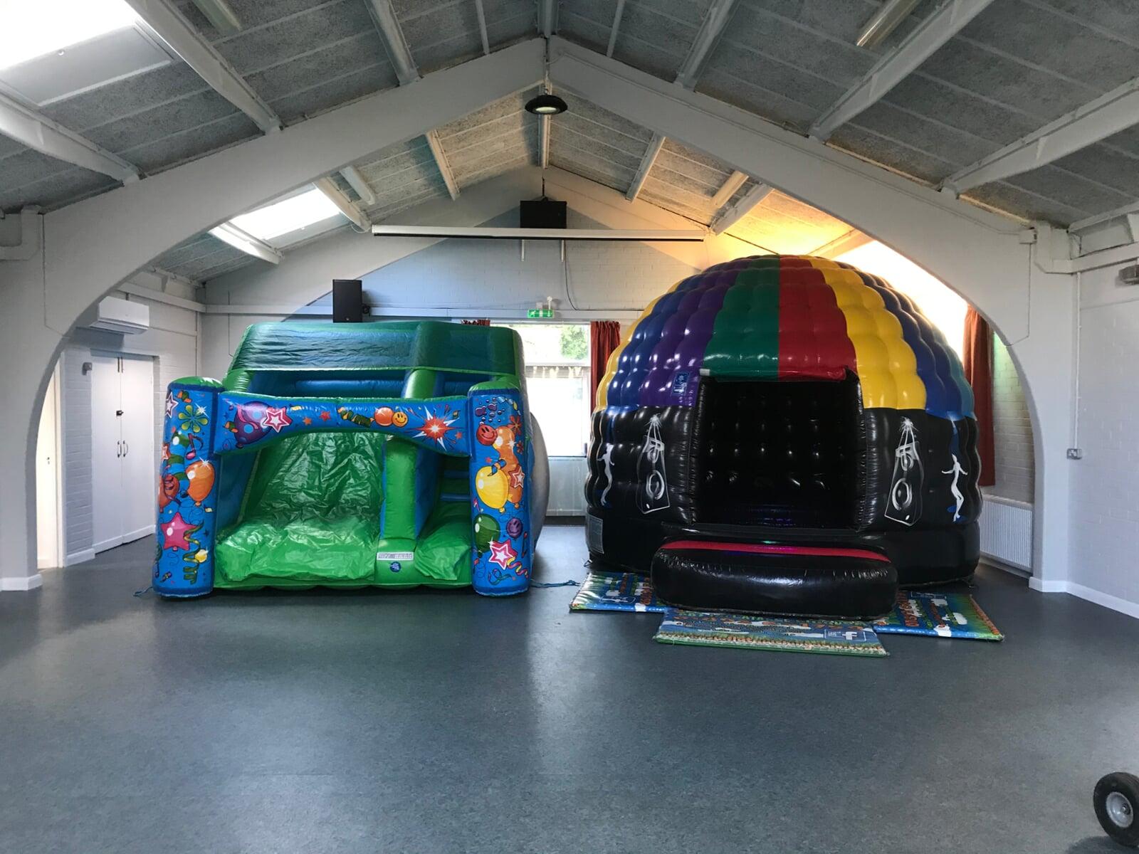 The main hall is 8.91m by 14.24m - that's 1,366 sq. ft. which is large enough for indoor sports, bouncy castles, meetings, parties, clubs, & training sessions. The pitched roof goes from about 3.2 metres above the floor to 4.5 metres. We have a premises license that allows almost any activity including sale of alcohol. Our facilities include: